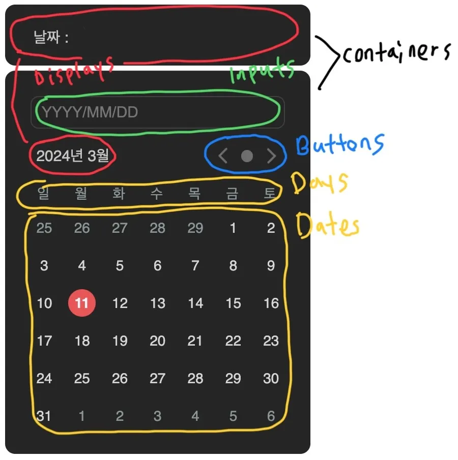 일단 Calendar.tsx 라는 하나의 파일 안에 기능과 UI를 모두 구현하고, 이후 각각의 컴포넌트로 분리하는 과정에서 고민이 있었다. 일단 그림을 그려 컴포넌트를 나누어 보았다.