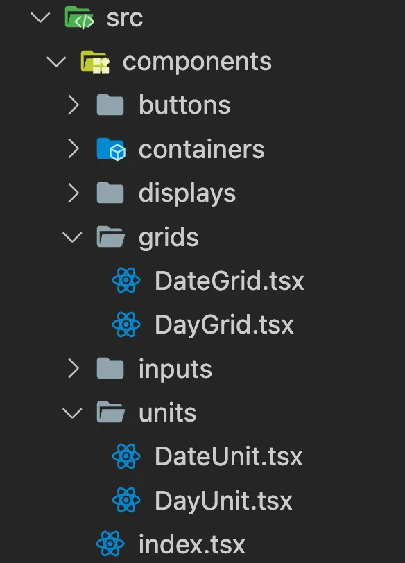 처음 코드를 짤 때는 같은 위계에 있는 컴포넌트의 이름을 container 라고도 짓고, grid 라고 짓기도 하고, component 라고 짓기도 했다. 근데 이들을 하나로 묶어야 하니 아예 grid라고 통일시키고, grid 라는 폴더 안에 DateGrid, DayGrid 이렇게 두었다.