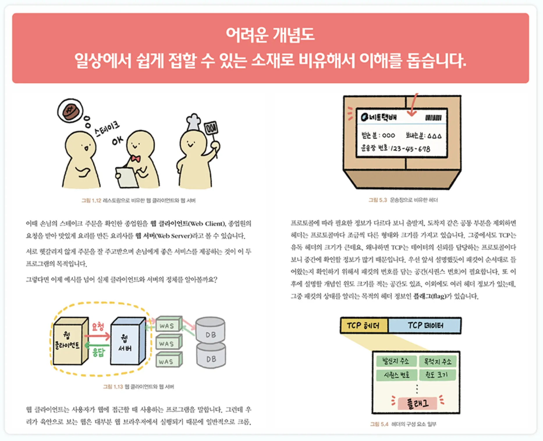 최근 <그림으로 쉽게 이해하는 웹/HTTP/네트워크> 이라는 책을 읽은 적이 있다. 평소 이해하기 어려웠던 네트워크 개념을 일상에서 쉽게 접할 수 있는 레스토랑, 택배 등으로 비유하고, 귀여운 그림과 함께 설명한 책이다. 이 책을 읽으면서 어려운 개념을 이렇게 쉽게 설명할 수 있구나 새삼 저자가 대단하다고 느꼈다. 네트워크에 대해 이해는 물론이고, 재미를 느껴서 2회독을 했을 정도다.