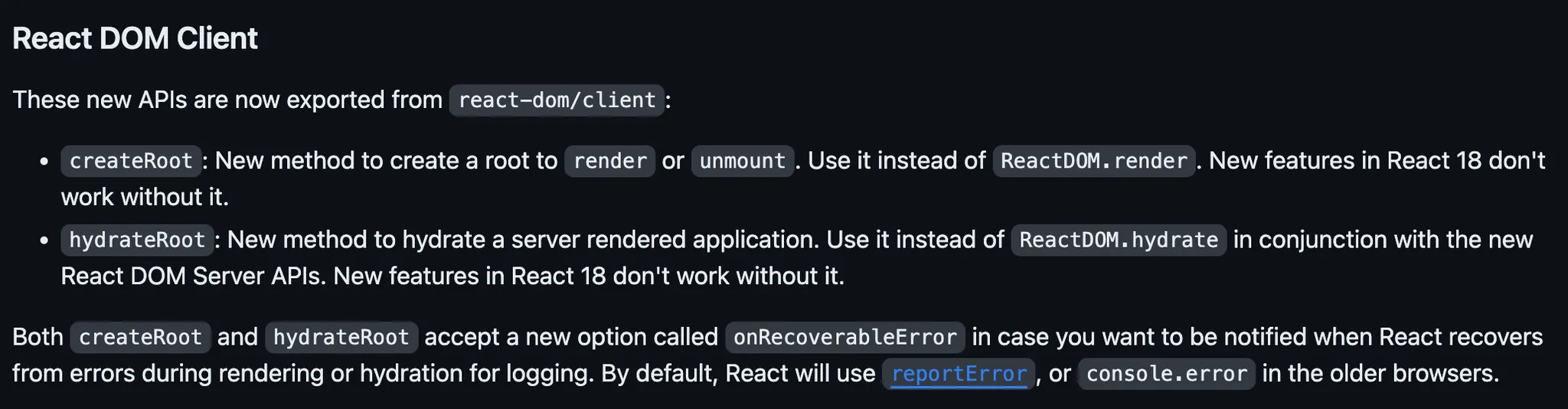 어쨌든 두 방법 모두 React 18의 새로운 기능인 ReactDOM.createRoot를 사용하고 있으며, 이는 React 18에서 도입된 최신 방식이다.
