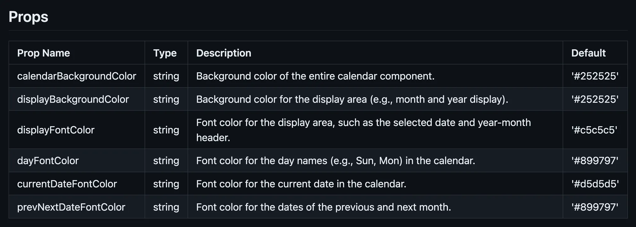 Datepicker 캘린더 라이브러리에서는 아래와 같은 다양한 prop들을 제공하기로 한다. 이들은 모두 사용자의 필요에 따라 선택적으로 사용할 수 있는 것들이다.