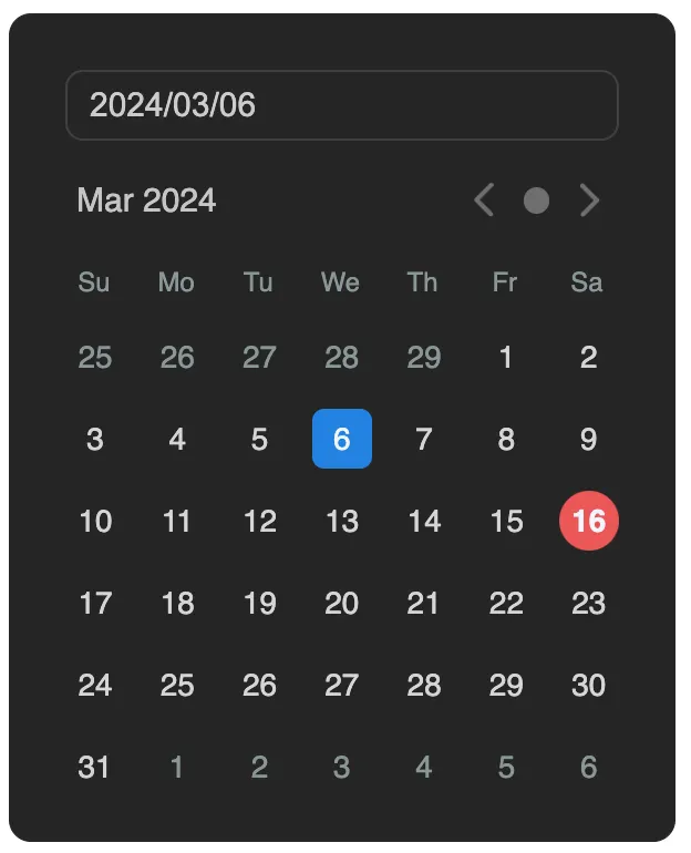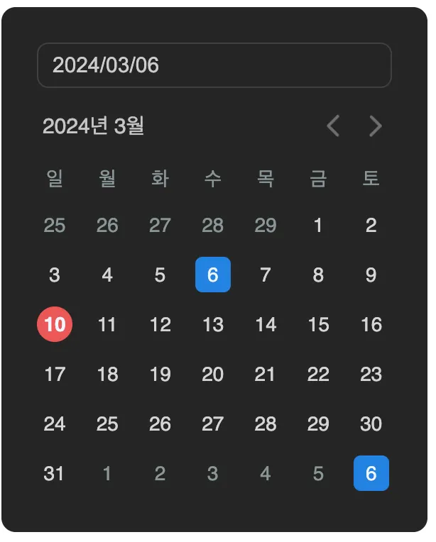 위 코드에서 isSelected 함수는 monthOffset 이라는 인자를 사용하여 선택된 날짜의 월이 현재 달력의 월과 일치하는지 여부를 검사한다. 그리고 각 날짜 컴포넌트의 클릭 이벤트에서는 해당 날짜가 속한 월의 오프셋을 전달하여, 사용자가 선택한 날짜만이 선택된 상태로 표시되도록 한다.