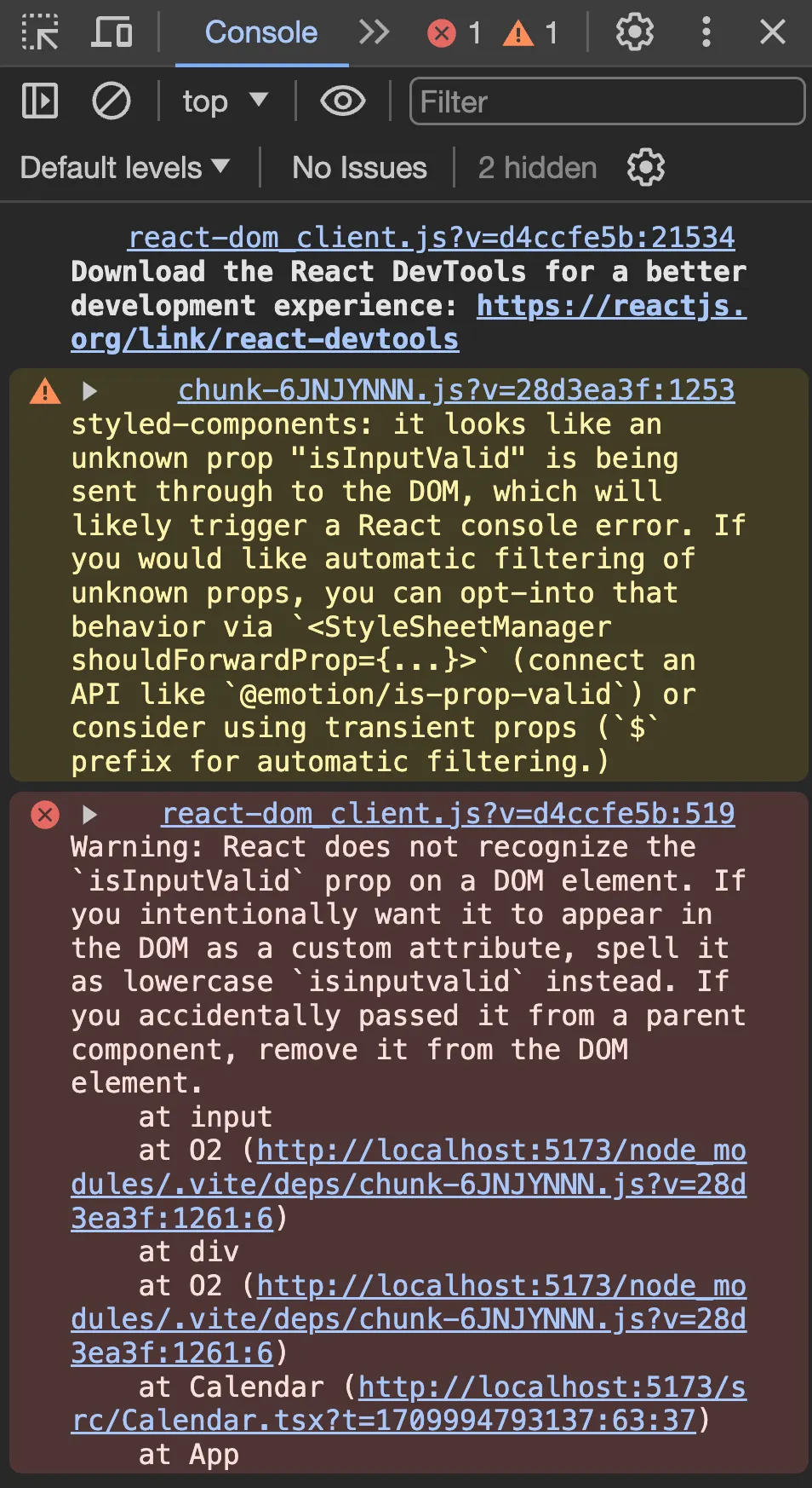 styled-components에서 isInputValid라는 알려지지 않은 prop이 DOM으로 전달되고 있어 React 콘솔 오류를 발생시킬 수 있다.