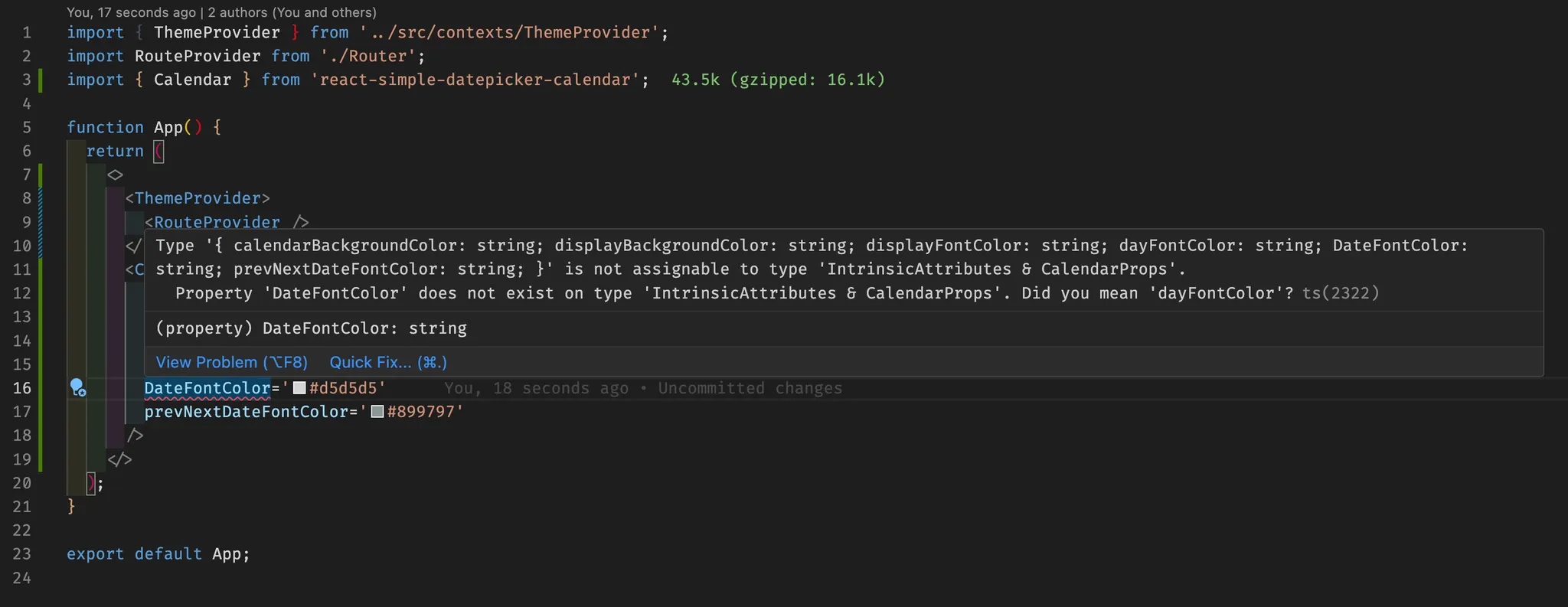 이게 무슨 말이지..? 요약하자면 DateFontColor 속성이 CalendarProps에 없다는 점을 이야기하는 것 같다. 일단 내가 만든 라이브러리 자체의 문제라고 생각하여, 차근차근 서칭을 해가며 해결해 보았다.