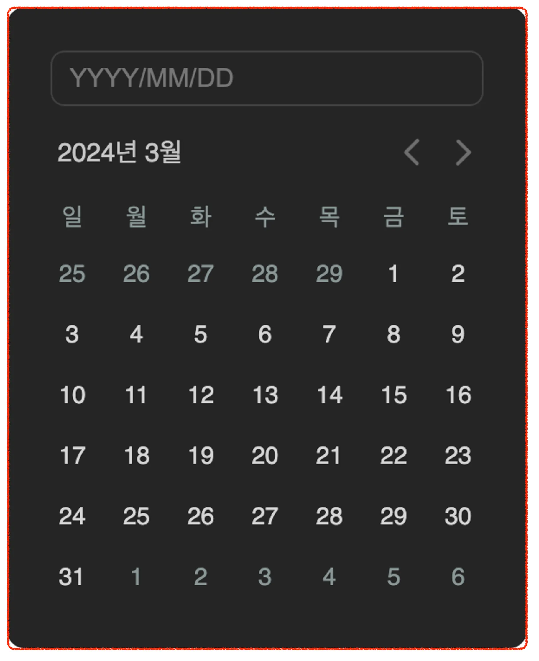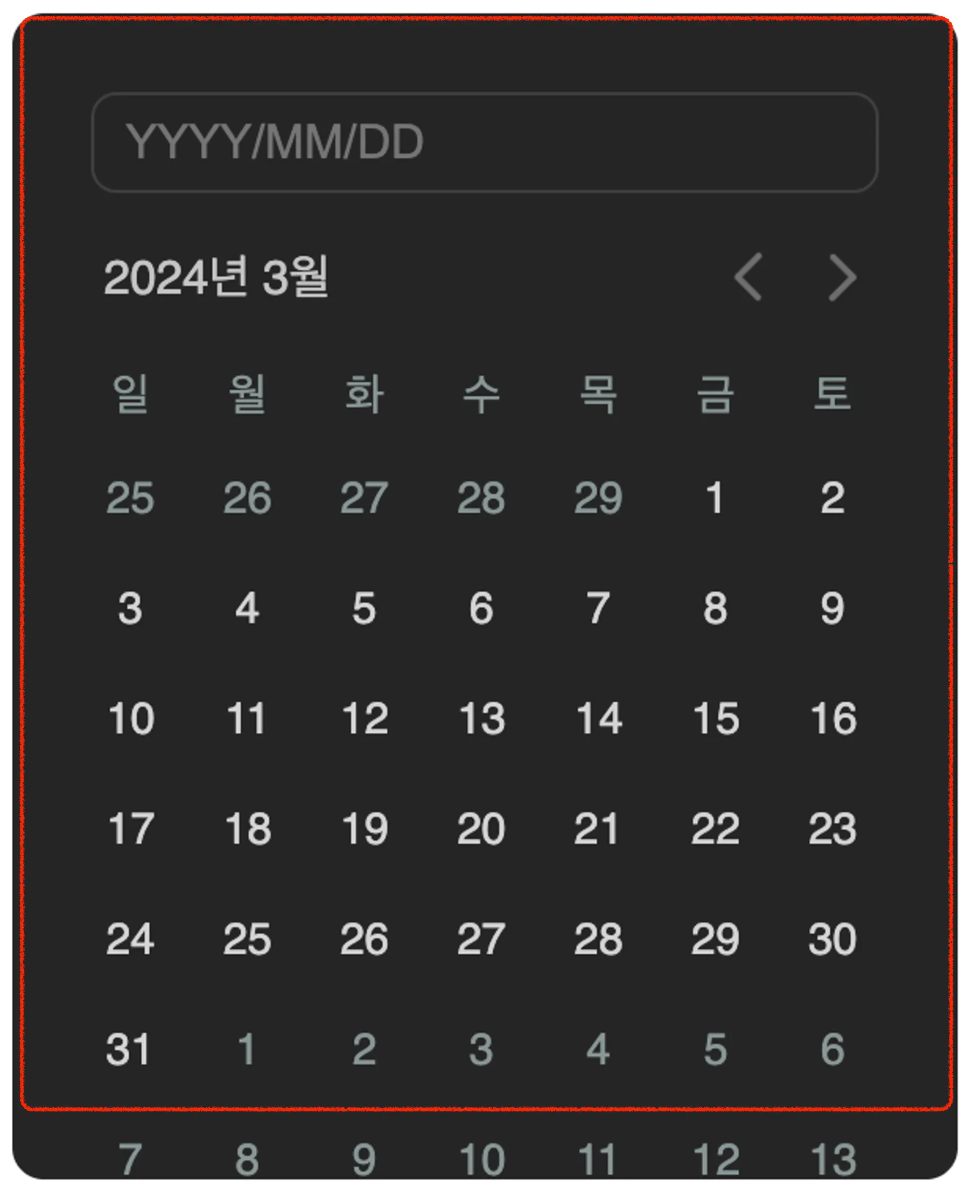 다음 달 날짜들이 빨강색으로 표시한 레이아웃 밖으로 나온다.