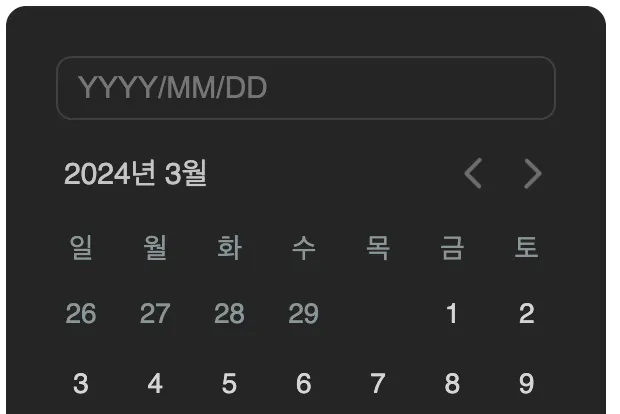 위의 코드를 보면, daysFromPrevMonth는 현재 달의 첫 날이 시작하는 요일에 맞추어 이전 달의 날짜가 필요한 수만큼 계산되어 배열에 추가된다. 그리고 nextMonthDaysLength는 다음 달의 날짜 수가 달력의 마지막 행을 채우는 데 필요한 정확한 수를 계산하여 배열에 추가한다.