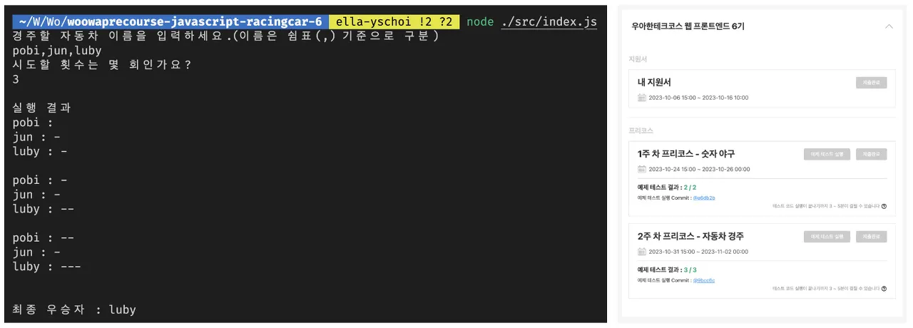 1주 차 미션의 목표는 git, 분야별 언어, 그리고 미션 사이클에 익숙해지는 것이었다. 그리고 2주 차부터는 우테코 미션 과정을 제대로 맛볼 수 있는 과제인 '자동차 경주' 게임이었다.
